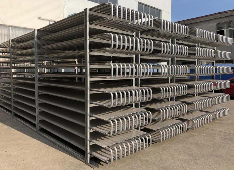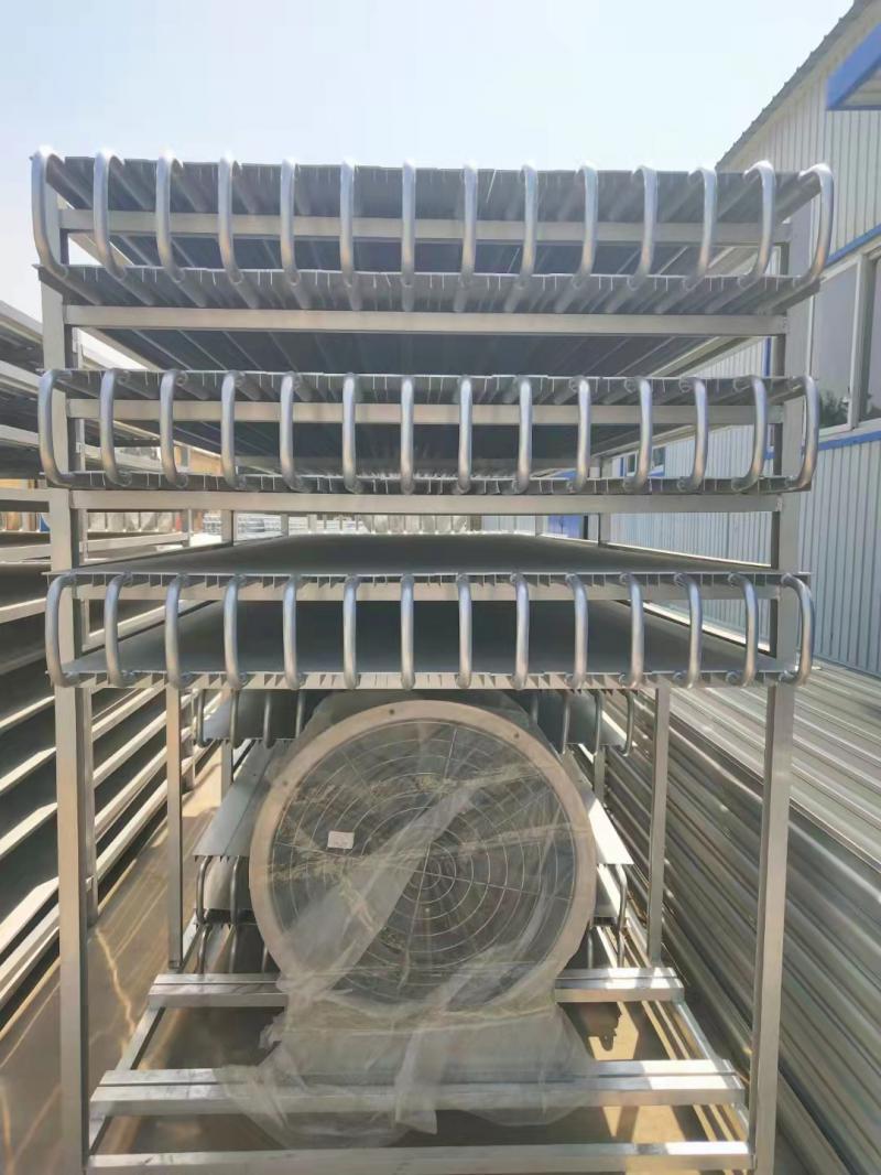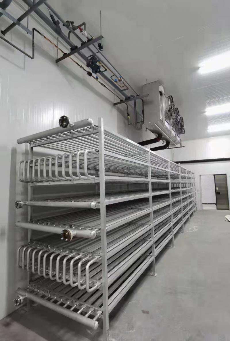 本實(shí)用新型公開了一種速凍間擱架,包括四根呈矩形排布的立柱,左右相鄰的兩根所述立柱之間穿插有連桿,前,后相鄰的兩根所述立柱之間穿插有第一連桿,所述連桿的外壁處開設(shè)有穿過所述第一連桿的孔,所述第一連桿的外部處焊接有擋板,所述擋板限位在所述立柱的內(nèi)側(cè),所述第一連桿穿過所述立柱的那一端螺紋連接有一螺母,在前,后設(shè)置的兩根所述立柱之間裝配有排架,所述排架上,下等距設(shè)置有多個(gè),在所述排架的側(cè)面橫向貫穿設(shè)置有多個(gè)安裝孔,還包括U字形的銅制的導(dǎo)冷管,所述導(dǎo)冷管的兩端穿過兩側(cè)的排架;本產(chǎn)品可以利用冷媒直接與被速凍的食品接觸,增加冷凍效率.
